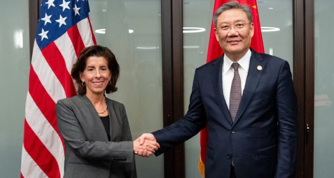 中国商务部部长王文涛与美国商务部长雷蒙多在旧金山举行两国商务部沟通交流机制首次部长级会谈。(图/中国商务部网站)