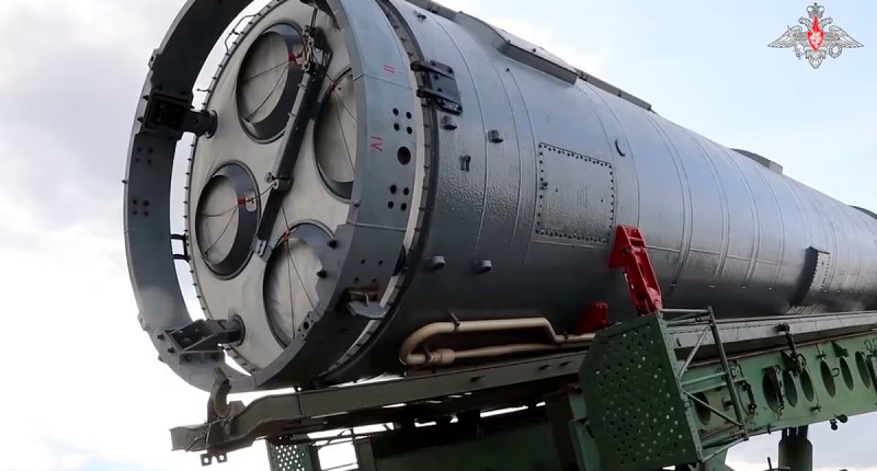 俄罗斯国防部旗下的“Zvezda”电视频道显示,一枚弹道导弹被运送到发射井,慢慢升到垂直位置,然后降入哈萨克斯坦附近奥伦堡地区的一个竖井。