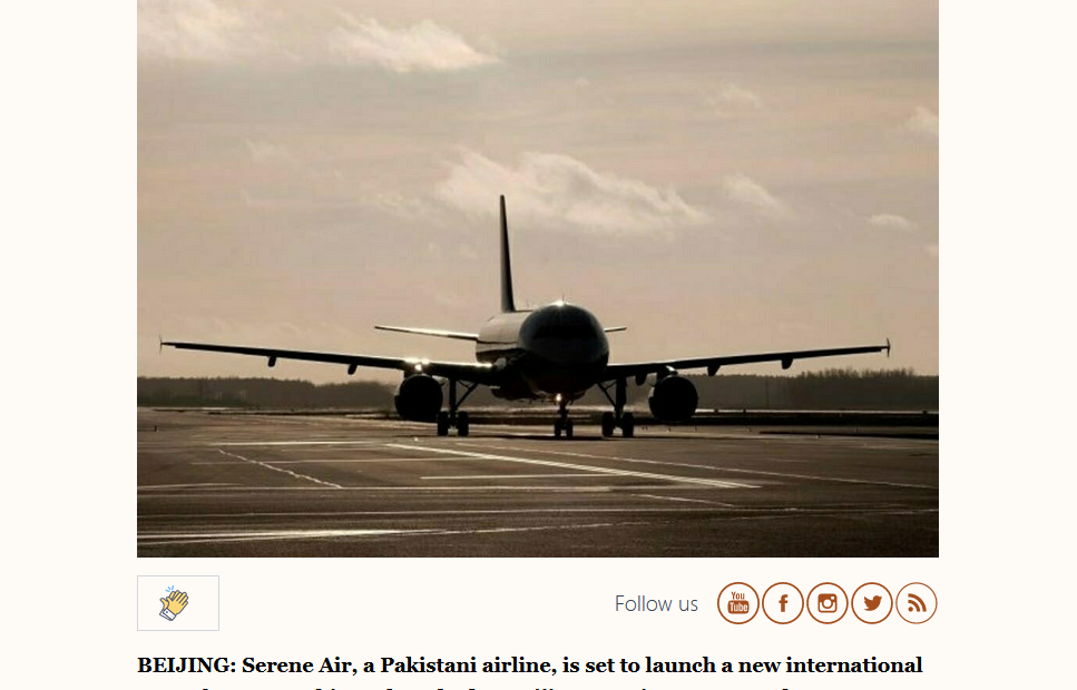 SereneAir19日将开通卡拉奇至北京航线。(图/《商业纪录报》网站截图)