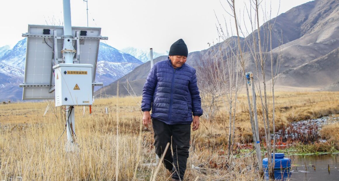 67岁的管护员冬花在温泉新疆北鲵国家级自然保护区工作已经有20年。图为11月1日,她在保护区内查看新疆北鲵的情况。(图/中新社)