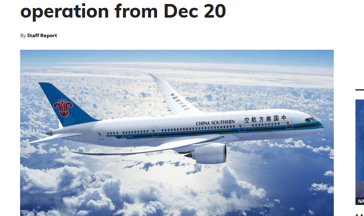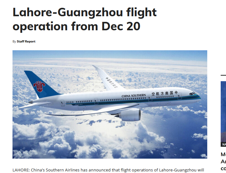 中国南方航空班机。(图/《今日巴基斯坦》网站截图)