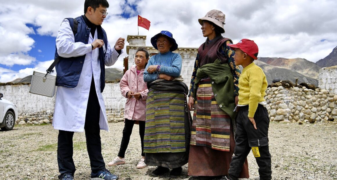 在拉萨市当雄县格达乡格达村义诊的援藏医生王克明(左一)为村民讲解健康知识。(图/新华社)
