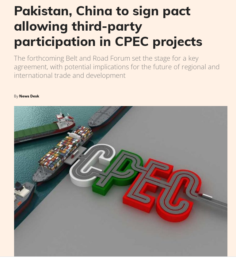 媒体评论称,即将签署的允许第三方参与中巴经济走廊项目的协议,突显了中巴两国继续致力于推进经济合作,扩大中巴经济走廊的范围。预计第三届“一带一路”国际合作高峰论坛将成为这一重要安排正式化的重要平台,将对地区和国际贸易和发展的未来产生潜在影响。(走元编译)