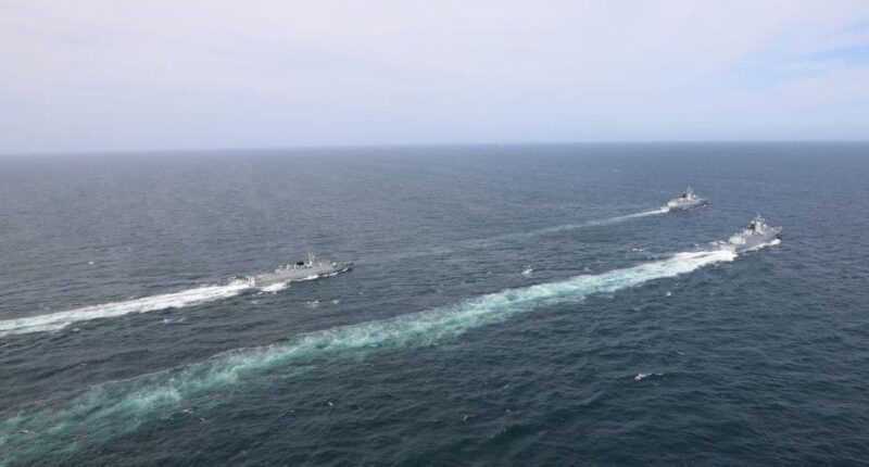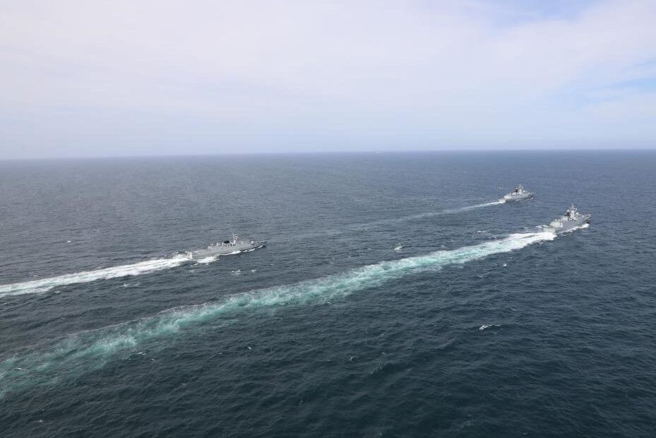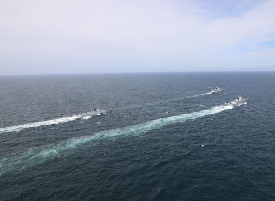2022年7月13日,中巴“海洋卫士-2”海上联合演习参演舰艇编队在预定海域分航。图为中巴双方舰艇组成两路纵队,准备分航的资料图。(图/新华社)
