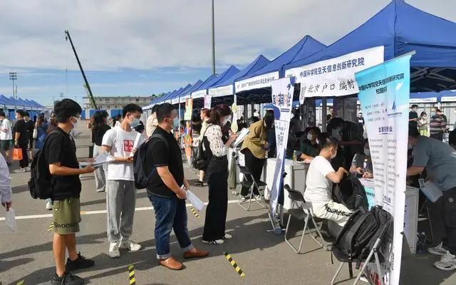 在北京朝阳区举办的线下招聘会上,大学毕业生们在企业展台前递交简历的资料图。(图/北京《新京报》)