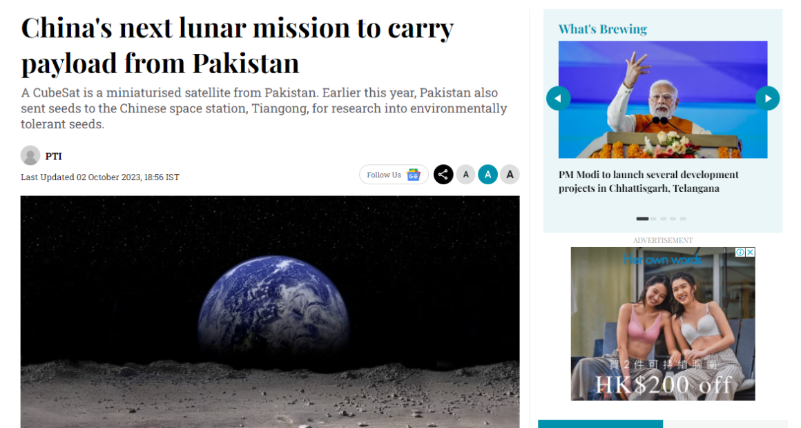 图为中国航天局近日表示,中国定于下一次2024年的探月任务将携带来自巴基斯坦的有效载荷。(图/印度《德干先驱报》网站截图)