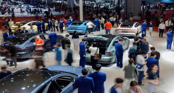 People gather around the electric-powered Jeep Avenger SUV at the Paris Car Show Monday, Oct. 17, 2022 in Paris. Europe is leading the charge into electric vehicles as battery powered cars break out of their niche market of first adopters and enter the mainstream with increasing market share that’s forecast to grow strongly as the EU pushes to phase out internal combustion engine vehicles by 2035 (AP Photo/Michel Euler)