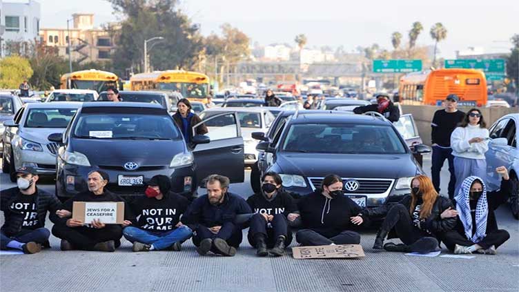据加州高速公路巡逻队称,周三上午高峰时段,要求加沙地带停火的犹太组织活动人士封锁了洛杉矶一条繁忙高速公路的交通,造成数英里范围内的交通拥堵。 上午 9 点左右,“如果不是现在”组织的抗议者在市中心 110 号高速公路南行车道上坐下,导致通勤者停下来。抗议者身穿黑色衬衫,上面写着“不以我们的名义”,并举着标语牌,要求以色列停止在加沙的军事行动。 KCAL电视台的视频显示,在警察到达之前,一些愤怒的驾车者与抗议者发生了冲突。 高速公路巡逻队称,当卫生防护中心官员上午 10 点左右开始清理高速公路时,大约 75 名抗议者被拘留。