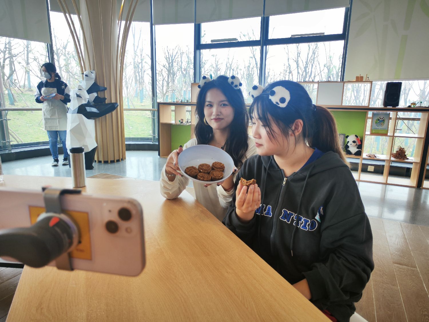 两岸青年博主在成都大熊猫繁育研究基地学习制作大熊猫“窝窝头”,并拍摄视频。(图/中新社)
