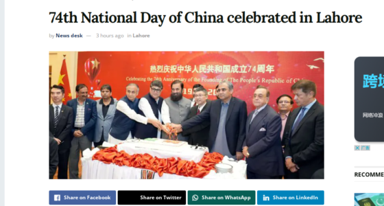 国际的 中国国庆74周年晚宴于旁遮普举办 中巴代表共切蛋糕庆祝 图为庆祝活动上,中巴代表共切蛋糕庆祝。(图/《巴基斯坦观察家报》网站截图) 【华商新闻网编译报道】24日晚间,中华人民共和国成立74周年国庆庆典在旁遮普一家酒店内举行,旁遮普省省长拉赫曼(Balighur Rehman)和看守政府首席部长纳克维(Mohsin Naqvi)作为主宾出席了庆典。 《巴基斯坦观察家报》26日报道,仪式上,旁遮普省各部官员与中国驻拉合尔总领馆代总领事曹珂共同切蛋糕,祝贺中国国庆。 曹珂对拉赫曼表示感谢,并表示纳克维最近对中国的访问对巴中关系具有里程碑意义。纳克维表示,巴中关系的新时代已经开始,两国在生活各领域的合作将进一步开辟新的途径。 纳克维称,巴基斯坦和中国为了光明与和平的未来站在一起。他说,事实证明,中国是我们全天候的朋友、强大的伙伴和可靠的邻居。 旁遮普政府感谢中方在各领域给予的支持与合作。拉赫曼表示,旁遮普省首席部长及其内阁对中国进行了成功访问。访问期间,双方就加强合作进行了令人鼓舞和积极的讨论;宣布萨希瓦尔和巴哈瓦尔布尔与中国城市结为友好城市的协议已经达成。(走元编译) MumtazSeptember 26, 2023