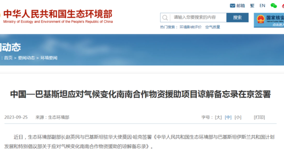 中国—巴基斯坦应对气候变化南南合作物资援助项目谅解备忘录在京签署。(图/中国生态环境部网站截图) 近日,中国生态环境部副部长赵英民与巴基斯坦驻华大使莫因·哈克签署《中华人民共和国生态环境部与巴基斯坦伊斯兰共和国计划发展和特别倡议部关于应对气候变化南南合作物资援助的谅解备忘录》。 中国—巴基斯坦应对气候变化南南合作物资援助项目是落实中国国家主席习近平提出的南南合作“十百千”倡议和“一带一路”应对气候变化南南合作计划的具体举措。为进一步推动巴基斯坦绿色低碳发展,提升其极端气候灾害的预警能力,根据此次双方签署的合作谅解备忘录,中方将向巴方援助5000套户用光伏发电系统、1套综合一体化气候变化监测与应用系统设备、5套智能气象地面观测站、1套综合云端灾害风险预警支持系统,并实施能力建设培训项目,为巴基斯坦提升应对气候变化能力提供支持。 此前中国已向巴援助7000套户用光伏发电系统,有效改善了瓜达尔地区贫困家庭用电照明的民生问题,积极推动了中巴经济走廊绿色低碳发展。截至目前,中国已与39个发展中国家签署47份合作文件,累计支持发展中国家超过12亿元人民币,培训近2300名相关人员,为相关国家积极应对气候变化提供了切实帮助,受到广大发展中国家的高度认可和一致好评。