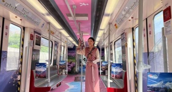 “林芝”号旅游专列展示“醉美林芝”的旅游景色。图为车厢内部。(图/中新网) 一辆“网红”专列当地时间14日早晨出发,由广州市番禺区驶向广州市中心繁华地段,西藏林芝大美风光再次登上广州旅游“快车道”。 进入车厢,粉红桃花“肆意开放”,雪山冰川映入眼帘……随着列车前进,乘客一路“穿梭”在桃花林、青稞地、村落旁。当天,在广州地铁3号线林芝旅游宣传活动,依托广州地铁日均1000万客流量数据,通过创意内包车和全线网200个灯箱,以线面结合产生裂变的宣传方式,为广大市民展示“醉美林芝”的旅游景色。 “林芝”号旅游专列展示“醉美林芝”的旅游景色。图为车厢内部。(图/中新网) 有乘客看到车厢中林芝美景后说:“总听说林芝是人间净地,这次坐上这台林芝旅游专列确实感到非常漂亮,下次长假一定要带家人一起,带着期待上路,出发林芝。”