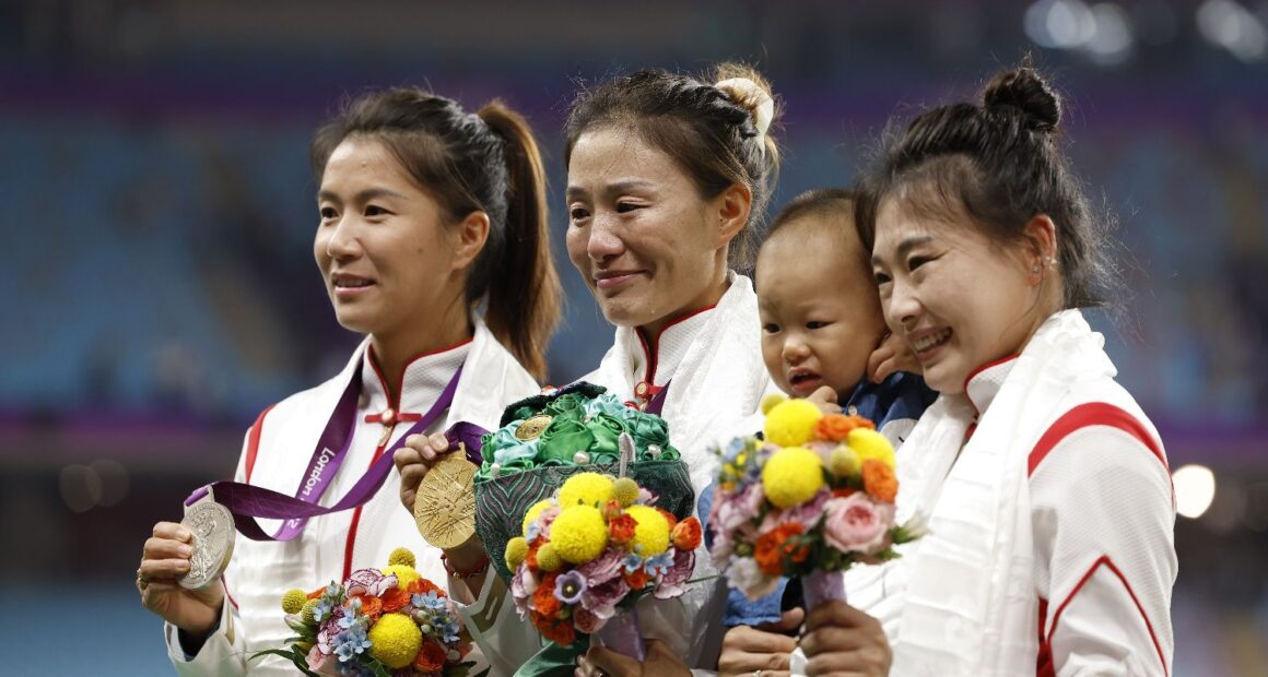 10月4日,中国田径运动员递补奥运奖牌仪式在杭州奥体中心体育场举行,递补获得伦敦奥运会女子20公里竞走金、银、铜牌的切阳什姐(左二)、刘虹(左一)、吕秀芝(右一)登场领奖。(图/中新社)