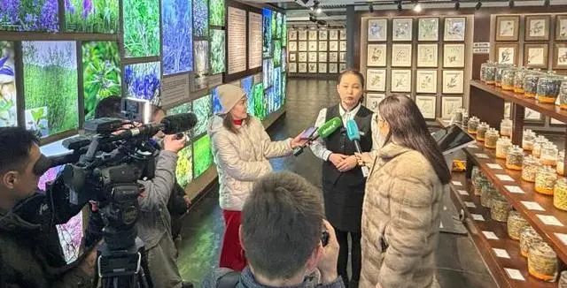 图为媒体代表在阿尔泰山中草药博物馆进行采访。(图/中新网)