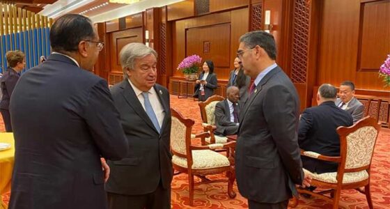 看守总理安瓦尔·哈克·卡卡尔周三敦促联合国秘书长安东尼奥·古特雷斯在制止以色列针对巴勒斯坦人的暴力方面发挥作用。 总理和联合国最高外交官在第三届“一带一路”论坛期间在北京会面。 总理在与古特鲁斯会面后在社交媒体平台X上发帖称:“我们要求结束这种不分青红皂白的攻击行为,并敦促国际社会迅速采取行动,制止暴力,追究责任人的责任。” 卡卡尔总理强烈谴责以色列对加沙Al-Ahly Al-Mamadany医院的袭击,造成大量平民伤亡。 他称针对一家医院、一个为有需要的人提供庇护所的袭击是“无可辩解的不人道行为”。 他补充说,国际人道法为医院和医务人员提供保护。