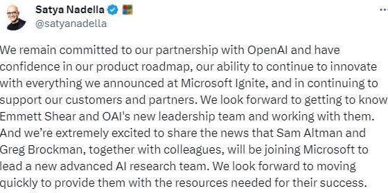 据报道,微软CEO纳德拉在社交媒体上发文称,美国人工智能研究公司OpenAI前首席执行官(CEO)山姆•阿尔特曼和前总裁格雷格•布罗克曼将加入微软,领导一个新的高级人工智能研究团队。   据报道,纳德拉表示,“我们仍然致力于与OpenAI的合作,对我们的产品路线图充满信心。”纳德拉还称,“我们非常激动地宣布,山姆•阿尔特曼和格雷格•布罗克曼将与同事一起加入微软,领导一个新的高级人工智能研究团队。我们期待着迅速采取行动,为其成功提供所需的资源。”   据此前报道,OpenAI于17日发表声明称,阿尔特曼将不再担任公司首席执行官一职并将离开公司董事会,布罗克曼将不再担任董事会主席。公司现任首席技术官米拉•穆拉蒂(Mira Murati)将出任临时首席执行官。 另据报道,由于阿尔特曼和布罗克曼离职的消息出人意料,OpenAI公司陷入混乱。目前,导致阿尔特曼被解职的具体原因尚不清楚,但知情人士称,OpenAI近期在商业领域的快速扩张令一些董事会成员感到不满,认为这种状况违背了该公司“安全发展人工智能”的信条,公司内由此产生的紧张气氛已经持续了一段时间。该公司董事会在17日发布的声明中称,阿尔特曼在与董事会沟通过程中“不总是坦诚的”,阻碍了其履行职责。